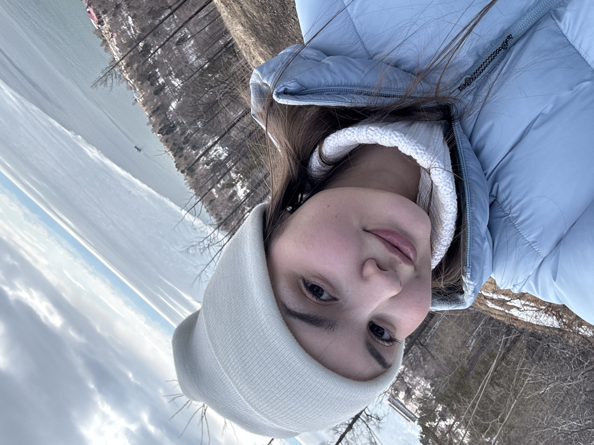 A selfie-style image captures a young female in the foreground, positioned at an elevated vantage point. She has fair skin, dark eyes, and dark brown hair, which is visible beneath a light gray knitted beanie. She wears a light blue puffer jacket over a white, possibly knit, high-collared garment. Her expression is neutral with a slight smile. The background reveals a panoramic view of a large body of water, likely Lake Baikal, extending to the horizon under a partly cloudy sky. The water exhibits a calm surface, reflecting light, with potential ice formations or bright reflections. A small, dark-colored boat is visible on the water in the mid-distance. The shoreline on the right features a wooded area with numerous bare, leafless trees, and patches of snow are visible on the ground, indicating a cold weather season. Several buildings with reddish roofs are discernible amidst the trees along the distant shore. The overall scene suggests a location in Nikola, Russia, overlooking Lake Baikal.