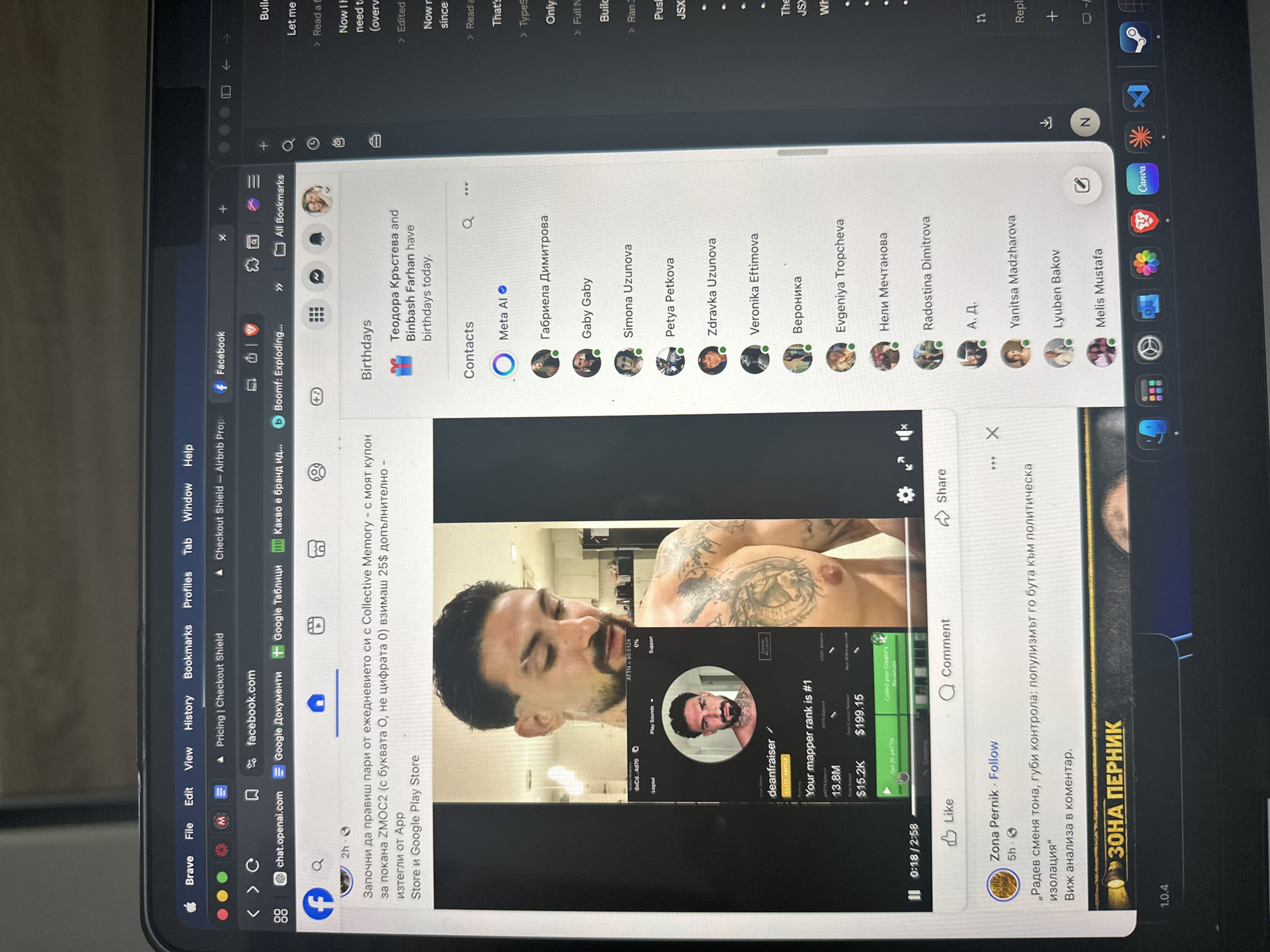 The image is a close-up of a laptop screen displaying a Facebook page in Bulgarian. The browser, Brave, is open to the Facebook website, where a post from "Zona Pernik" is visible. The post includes a picture of a man with tattoos and a shirtless torso. The post is about a change of tone and loss of control, pushing towards political isolation. Other browser tabs show various websites, including chat.openai.com, Google Documents, Google Tables, and a "Checkout Shield" tab. The laptop is also displaying a list of Facebook contacts and birthdays on the right side of the screen. The location is not identifiable within this image.