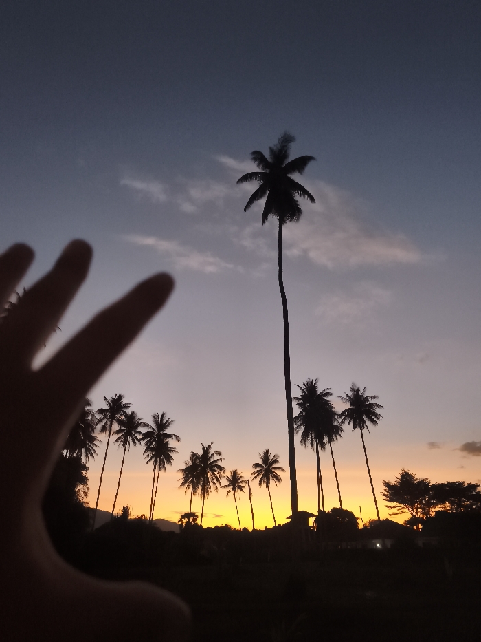 The image depicts a twilight scene, likely sunset, captured in Baan Mae Nam, Thailand. The sky transitions from a deep indigo-purple at the top to a vibrant orange and yellow gradient along the horizon, with minimal scattered clouds. In the immediate left foreground, a blurred human hand, with fingers splayed, occupies approximately one-third of the frame. The middle ground and background are dominated by a dense line of palm trees, presented in dark silhouette against the luminous sky. One exceptionally tall and slender palm tree stands prominently in the center-right. Below the silhouetted tree line, the landscape appears as dark, indistinct terrain, possibly comprising additional foliage and low-lying structures, with a single faint light visible from a distant building on the far right.
