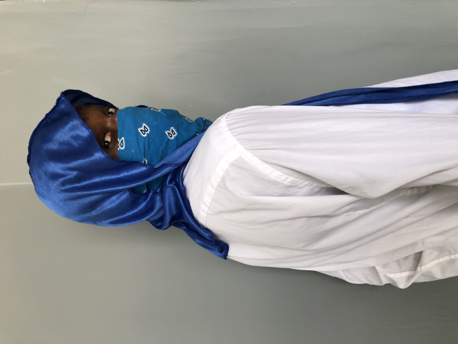 A single individual is depicted in a medium shot, positioned with their back partially to the viewer, looking over their right shoulder. The individual has dark skin and wears a bright royal blue, satin-like hood or head covering that drapes down the back. A lighter blue bandana with a white paisley pattern covers the lower half of their face, from just below the eyes to the chin. Only the individual's eyes are visible, directed towards the viewer. They are dressed in a white long-sleeved button-up shirt. The background is a plain, light grey wall. The scene is located in the city of Joma, Ghana.