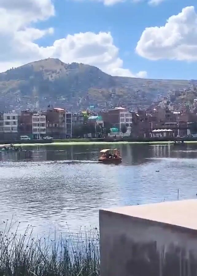 lake on a sunny day, with a small motorboat carrying people moving across the water. The lake is surrounded by buildings and a hillside. There are some reeds in the foreground, partially obscuring the view. A concrete structure is also partially visible. The sky is blue with scattered white clouds. The boat is moving from left to right across the frame.