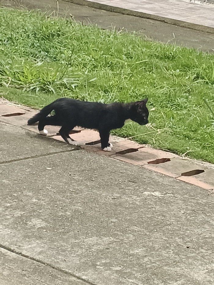 - "A black cat with white paws walks on a concrete path next to grass" by FM-n8S452, licensed under CC BY 4.0