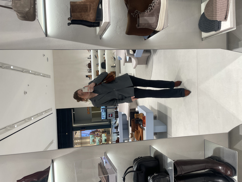 This image depicts the interior of a modern footwear and accessories retail store located in the city of Kommunarka, Russia. The central focus is a full-length, vertical mirror reflecting a female individual. The woman, with light brown hair pulled back, is standing slightly turned to her right, holding a white smartphone in her right hand at chest height, actively taking a selfie in the mirror. She is wearing a dark grey, oversized blazer over a darker inner top, black flared trousers, and pointed-toe brown heels. A brown leather shoulder bag is slung over her left shoulder. The store environment is brightly illuminated with recessed ceiling lights and integrated lighting within the display units. The walls and floor are a light, neutral color, contributing to a clean, minimalist aesthetic. On the left side of the mirror, integrated wall shelves display various black handbags and pairs of brown and black boots. On the right side, similar shelves showcase a light grey duffel bag, black and brown ankle boots, a taupe high-top sneaker, and two ribbed knit caps (one dark grey, one light pink/beige). In the background reflection, beyond the woman, additional sections of the store are visible. These include multiple white display shelves presenting a variety of shoes and smaller bags, as well as several light-colored, ergonomically shaped seating units and pale blue rectangular display tables. The overall scene indicates a commercial setting for fashion retail.