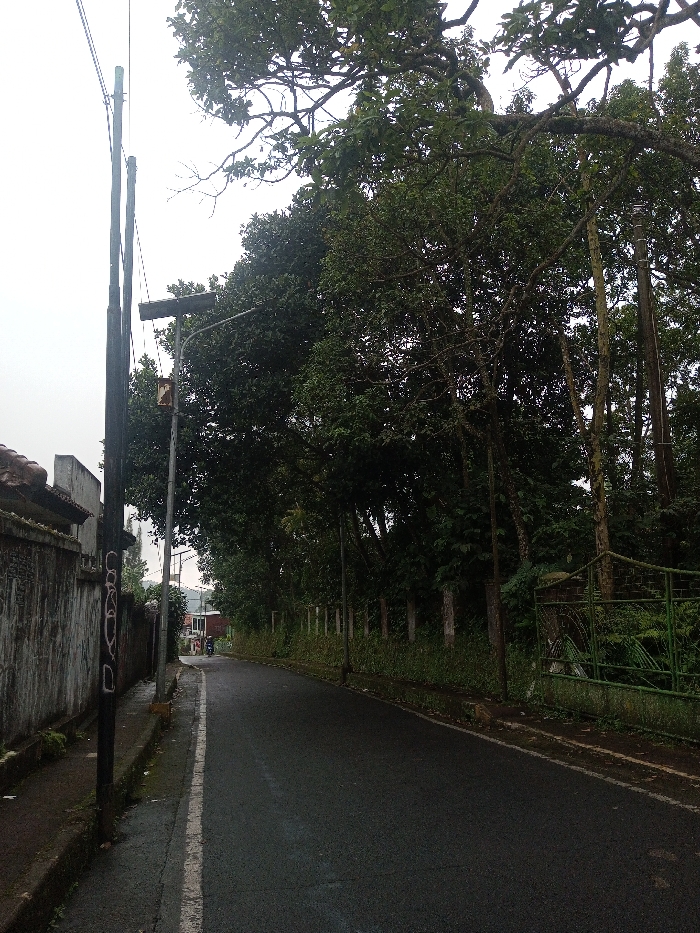 This image depicts a street scene in Laggala, Sri Lanka, under an overcast sky. A wet, dark asphalt road curves gently to the right, extending into the background. A solid white line delineates the left edge of the road, bordering a narrow, damp sidewalk or curb. On the left side of the scene, a dark utility pole, marked with white graffiti, stands prominently near the foreground, supporting multiple overhead wires. Behind the pole, a weathered, grey-brown wall with a tiled top runs parallel to the road. In the distance along the left, residential structures with a reddish roof are partially visible. Two individuals on a dark scooter or motorcycle are observed traveling away from the viewer in the far distance on the road. The right side of the road features a narrow, unpaved verge covered with damp soil and sparse vegetation. A dense line of mature trees with dark green foliage borders the entire right side, extending upwards and backwards, partially obscuring smaller utility poles and a street lamp pole with a horizontal fixture. Further along this tree line, a dark green metal gate or fence with intricate patterns is partially visible. The overall environment is heavily vegetated and appears damp.
