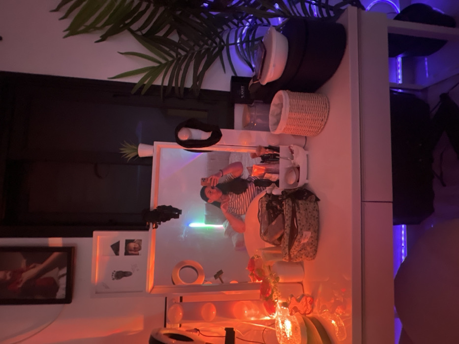 The scene is an interior room located in Kiryat Yam, Israel, centered on a white vanity desk and mirror setup. A female individual, with long dark hair and wearing a striped top, is visible from the chest up in the reflection of a large white-framed mirror, actively taking a selfie with a smartphone held to her face. The white desk is systematically arranged with various personal items: an illuminated cylindrical lamp emitting orange light, a lit candle in a clear holder, small artificial orange flowers in white vases, two patterned cosmetic bags, a white organizer containing makeup brushes and sponges, a small white woven basket, and a dark stand topped with a white bowl positioned on the far right. Above the desk, on the left wall, two framed photographs are displayed: a dark-framed picture of an infant being held, and a white-framed picture showcasing a footprint alongside a child's face. To the right of the mirror, a small potted plant is situated on a surface, and a large artificial palm-like plant, adorned with purple lighting strips, occupies the right side of the frame. The room's ambient lighting transitions from a prominent orange-red hue on the left to a blue-purple light on the right, particularly illuminating the artificial plant. An RGB light strip is reflected in the mirror behind the individual, along with a bed featuring a light-colored headboard and pillows. A dark window or door is visible behind the mirror, and the base of a chair is partially seen beneath the desk.