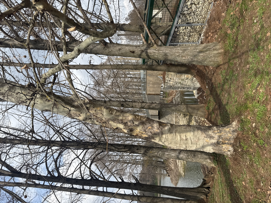 The image depicts a forested waterside area in Nikolovo, Bulgaria. The foreground is dominated by several large, bare deciduous trees, primarily a central plane tree with mottled bark and a strong lean to the right, and other tall, slender trees with bare branches. The ground is a mix of brown leaf litter and sparse green vegetation, with visible shadows from the trees. To the left, a calm body of water, likely a lake or wide river, is visible, with low, muddy banks lined by more bare trees. In the midground, spanning across a channel or gully, are two distinct man-made structures. The structure to the left is an elevated walkway or bridge, featuring horizontal wooden slat cladding along its sides and clear glass railings on its upper surface. This structure is supported by a light-colored, mortared stone wall foundation on the nearer bank. To the right of this, partially obscured by trees, is another bridge or pathway section with a green-painted metal framework and dark mesh infill for its railing. This section appears to be supported by a gabion-style retaining wall at its base, filled with rocks. The background consists of a dense stand of bare trees, possibly a mix of deciduous and conifers. The sky is partially cloudy with patches of blue. No individuals are present in the scene.