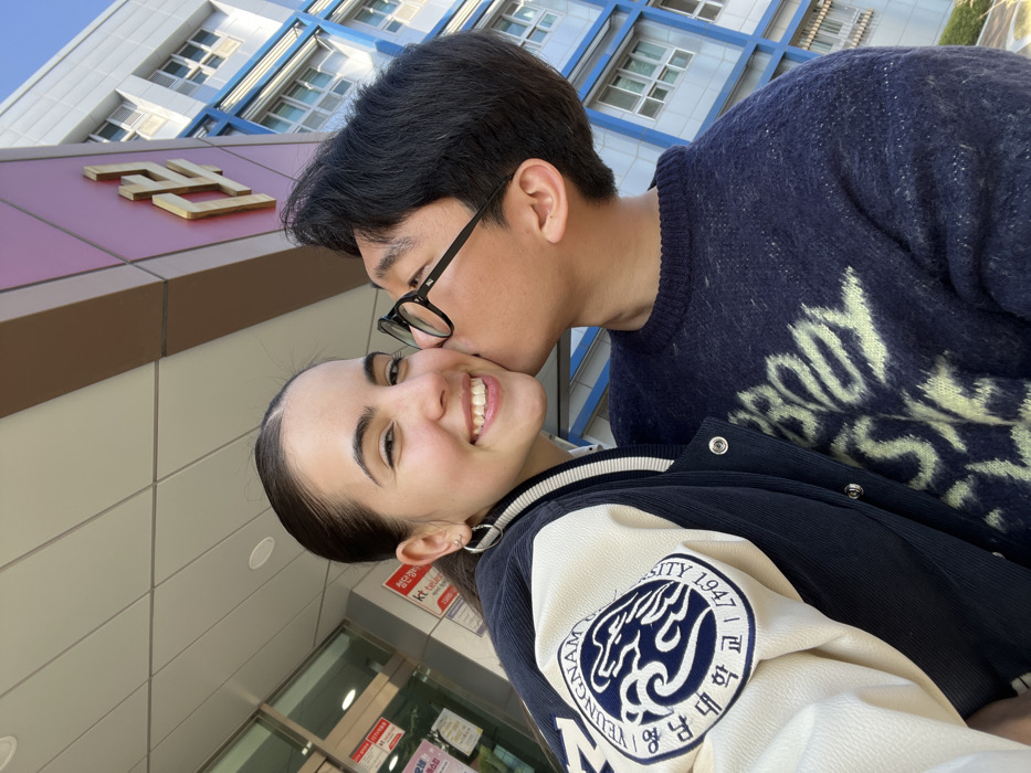 A young woman and a young man are captured in an affectionate moment outdoors, likely on a university campus in Daegu, South Korea
