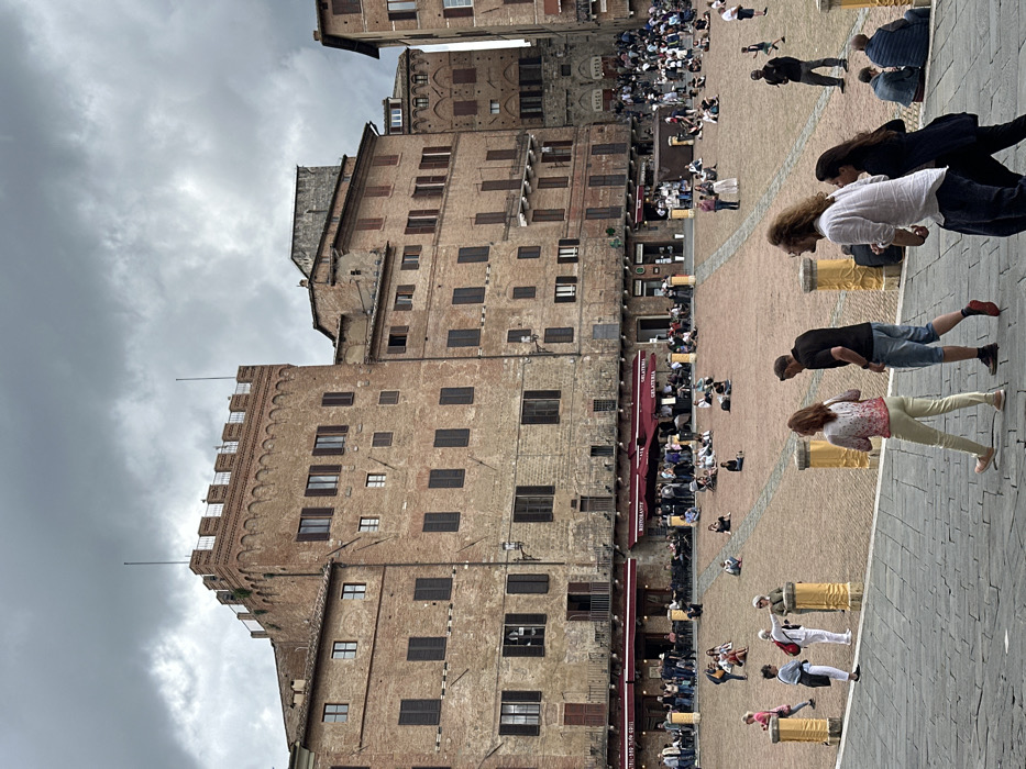 The image depicts Piazza del Campo in Siena, Italy, under an overcast sky
