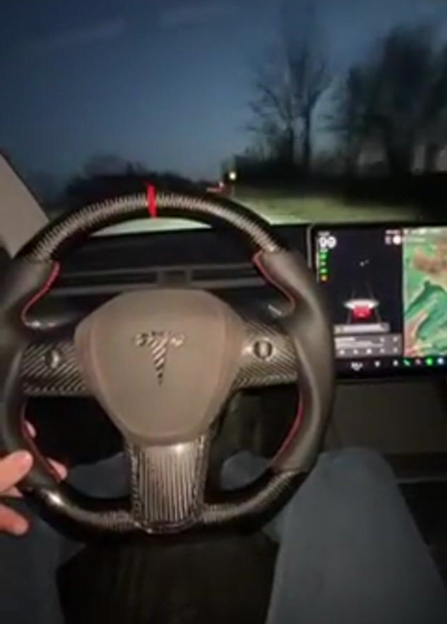The camera is situated within the driver's seat of a Tesla, providing a first-person view of the driver and dashboard
