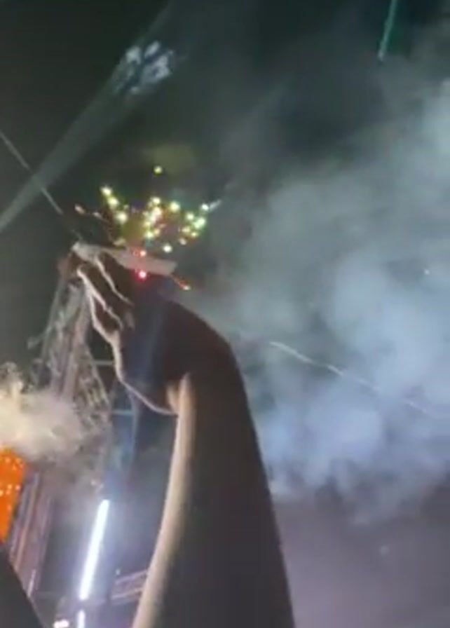 night-time scene with a crowd of people watching a display of pyrotechnics. In the foreground, people raise their hands and cell phones to record the event. The background features a stage structure illuminated with bright lights. Smoke and sparks are visible as fireworks explode in the sky. The people in the crowd appear excited, with some individuals turning to face the camera briefly.