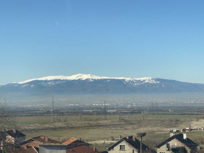 The image depicts a panoramic view of the Sofia region in Bulgaria, looking south towards Vitosha Mountain on a clear day