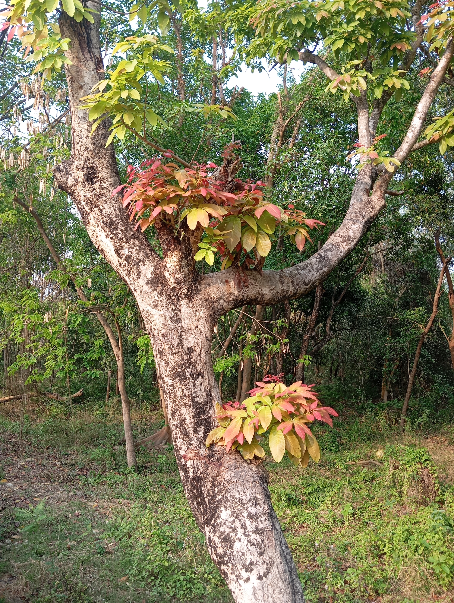 The image captures a tree with a thick, mottled trunk in Lumbini Sanskritik, Nepal. The tree's trunk leans slightly and branches into a 'Y' shape. Clusters of leaves, some with reddish hues and others with lighter green tones, sprout from the trunk and branches. The background features a densely vegetated area with a variety of trees and greenery, suggesting a forested or park-like setting. The ground cover is primarily green, with hints of brown leaves and grass.
