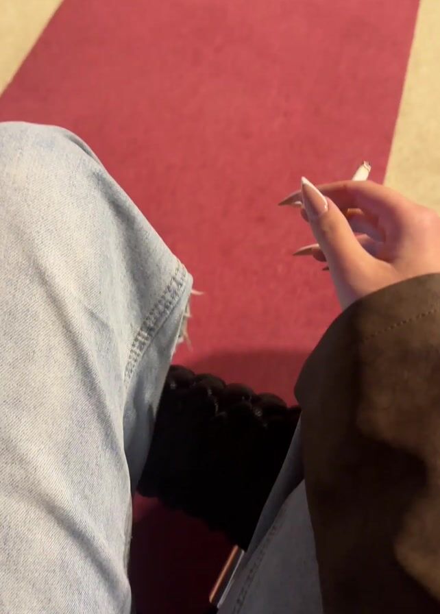 The camera is positioned above and angled down at a person sitting. They are wearing light-wash jeans and a dark brown jacket. Their left hand is holding a lit cigarette. The background is a red carpet with tan colored trim.