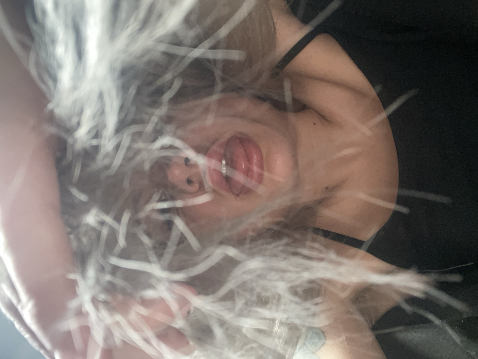 The image depicts a close-up, chest-up view of an individual, likely a young adult female, positioned centrally against a dark, indistinct background. Her face is partially obscured by a dense arrangement of blurred, light-colored, thin, linear strands, resembling disheveled hair or fibrous material, creating a foreground effect. The individual's mouth is open, with the tongue extended outwards. Her lips appear full, and a light reflection is visible on her teeth. A prominent tattoo, light blue in color, is discernible on her left shoulder/upper arm. She is wearing a black garment, consistent with a tank top or camisole, with a strap visible on her right shoulder. A hand is partially visible in the upper left quadrant of the frame, positioned above and behind the fibrous material. The specific location in the city of Tilburg, Netherlands, is not discernible from the visual evidence presented in this image.