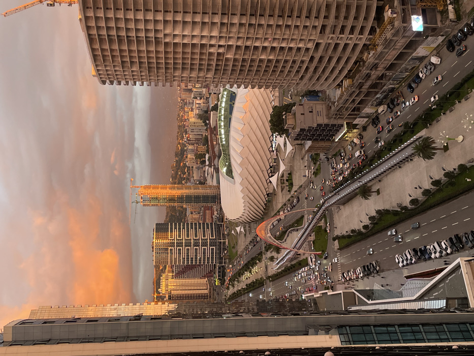 This image depicts an aerial view of Batumi, Georgia, at dusk, characterized by a sky displaying orange and grey clouds under the light of a setting sun. The central feature is the Batumi Arena, a modern stadium distinguished by its white, horizontally ribbed, and undulating exterior. To the stadium's immediate west, a wide, multi-lane roadway is observed with heavy vehicular traffic, including numerous cars, SUVs, and vans; many vehicles have illuminated headlights. Parked vehicles line the road shoulders. A prominent pedestrian bridge, featuring a central orange-illuminated arch and twin elevated walkways, spans a segment of this roadway. Palm trees and streetlights are interspersed along the central median and sidewalks. On the immediate right, a large, multi-story building is under construction, revealing an exposed concrete framework and a curved exterior. A construction crane is visible near its apex. On the far left, a modern, glass-clad high-rise building reflects the orange hues of the sunset. The background reveals a dense urban development consisting of multiple high-rise buildings, some of which are under construction with visible cranes, extending towards hazy mountains in the distance. Specific individuals are not discernible due to the distance.