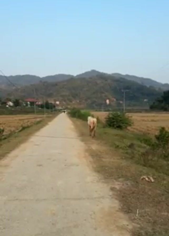 A medium, static shot faces down a lightly worn, narrow dirt road, flanked on both sides by dry grassy fields. A light-colored cow walks away down the center of the road. In the distance, a small village is visible, nestled against a backdrop of forested hills under a clear blue sky. A small, round object, possibly the moon, is visible high in the sky.