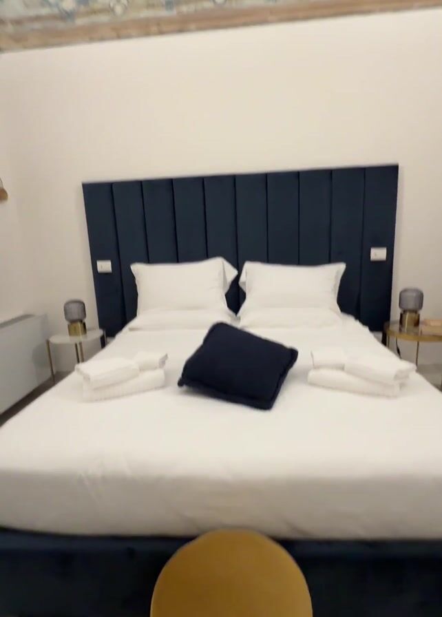 - "bedroom. A king-sized bed with a dark blue headboard and frame is centered in the frame, covered in white linens and topped with folded white towels and a dark blue pillow. A golden yellow velvet stool sits in front of the bed on a gray and white checkered tile floor. Two small round side tables are located on either side of the bed, each with a small lamp. The walls are white, and a decorative metal piece hangs on the wall to the left. An air conditioning unit is visible below the decoration. The camera pans upward to show an ornately decorated ceiling with painted murals and designs in muted blues and browns." by FM-VRFd13, licensed under CC BY 4.0