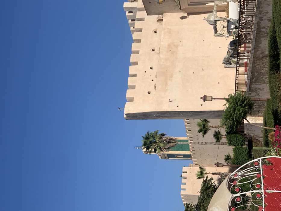 This image depicts a sunny outdoor scene in Al Machouar – Stinia, Morocco, dominated by historical architecture and lush vegetation
