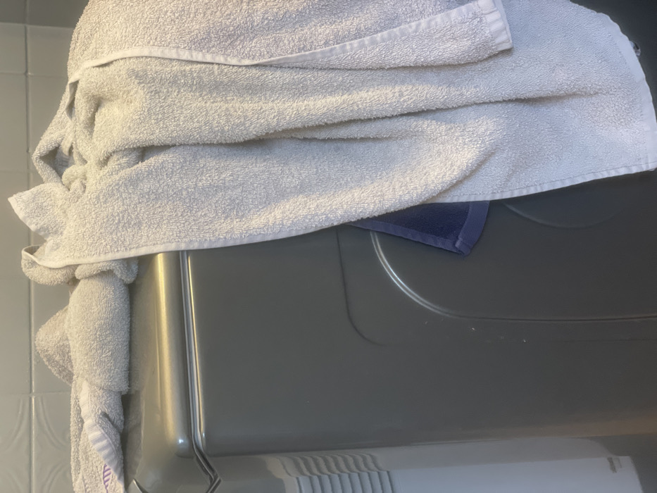 The image depicts an indoor scene in Fegersheim, France, focusing on a light grey appliance, likely a washing machine or dryer. Draped across the top and cascading down the right side of the appliance are several off-white or light cream terry cloth towels. A segment of a light purple or lavender towel is visible on the right side, tucked beneath one of the larger towels, extending down the appliance's side. The background features white rectangular tiles on a wall directly behind the appliance, and a portion of a white, vertically ribbed object is visible on the far left. The lighting is soft, highlighting the texture of the towels and the reflective surface of the appliance. No individuals are present.