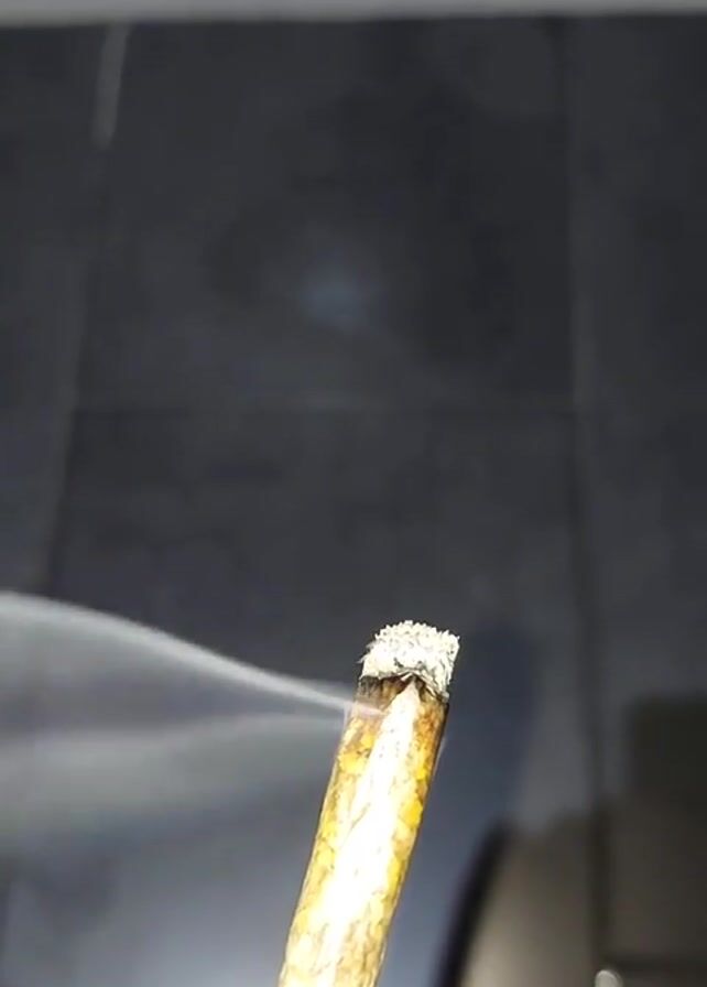 A person’s hand holds a lit, rolled cigarette in front of a gray tiled wall. The cigarette is tan in color and is burning at the tip with a white ash forming. A thin stream of white smoke rises from the burning end of the cigarette. The light catches the smoke, accentuating its wispy texture. The background includes a partial view of another object.