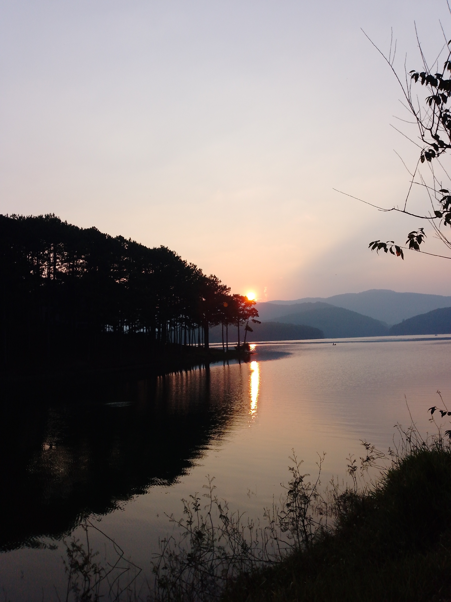 The image presents a tranquil, natural landscape depicting a lake or reservoir at sunrise or sunset, situated in an unspecified rural area. In the immediate foreground on the right, dark, silhouetted vegetation, including grasses and small branches, partially frames the water's edge. The left shoreline is defined by a dense, uniform line of tall, dark evergreen trees, likely pines, silhouetted against the sky. The bright, orange sun is low on the horizon, partially obscured by the upper canopy of these trees, casting a prominent golden-orange reflection across the calm water towards the viewer. In the mid-distance on the water, two small, dark objects, identified as boats or canoes, are present. Beyond the water, a series of hazy, blue-grey mountains recede into the distance. The sky above displays a gradient from pale lavender-grey at the zenith to a warm orange-pink near the horizon. No people are explicitly visible, though the boats indicate potential human presence or activity.