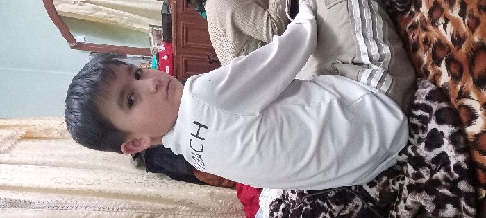 The image depicts an indoor scene in the city of Unknown, Unknown. A young male, approximately 8-12 years old, is seated with his back partially turned, rotated to face the camera. He has short, dark hair and a neutral expression. He wears a white long-sleeved, collared top with the word "YBACH" in black capital letters printed on the upper back. He also wears light beige or tan trousers, possibly with white horizontal stripes on the legs. He is positioned on a surface covered by a brown, black, and tan leopard print blanket. In the background, to the left, light-colored curtains with a decorative valance are visible. To the right, a dark wooden dresser or cabinet holds various items, including a red box and a white box. A wooden-framed mirror rests on the dresser, reflecting a light blue wall. Partially obscured behind the boy's left shoulder is a dark garment, possibly a jacket, with a fur-trimmed collar. To the right of the boy, another individual's back and shoulder are visible, draped in a light beige, possibly knitted, garment.