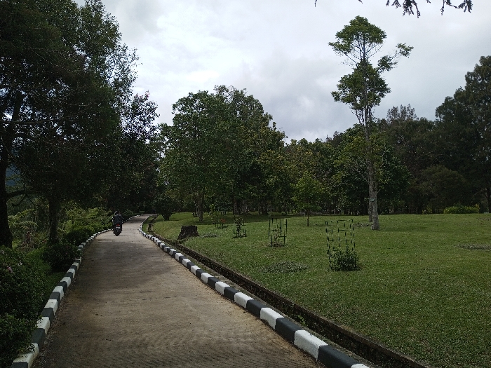 A paved road curves gently through a park, lined with black and white curb stones. A person rides a motorcycle away from the viewer. The park is filled with mature trees and green grass. In the distance, there are more trees and a cloudy sky overhead. There are a few small trees with square wire cages around them. A tree stump is visible on the right.
