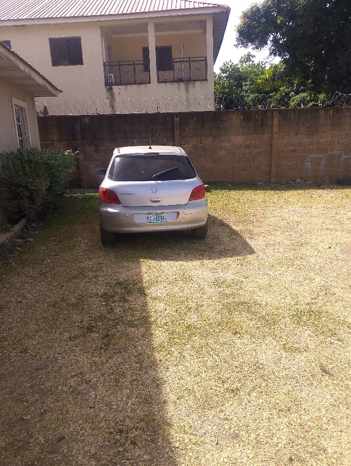 The scene depicts a residential outdoor area in Jos, Plateau State, Nigeria, under bright sunlight. In the foreground, a silver-grey Peugeot 307 hatchback is parked facing away from the viewer on a patch of dry, sparse grass. The vehicle's Nigerian license plate, "PLATEAU MGU-409AG", is clearly visible on the rear bumper. A distinct diagonal shadow from an unseen object falls across the left portion of the grassy area. Behind the car, a low, rough-textured concrete or brick wall spans horizontally across the frame. This wall is fortified with multiple strands of coiled razor wire along its top. Above and behind this barrier, a two-story building with a light-colored (beige or cream) facade and a reddish-brown corrugated roof is visible. The upper floor of this building features an open balcony equipped with a black wrought-iron railing, displaying two dark-colored doors or windows, and a larger dark-framed window to the left. Discoloration or staining is apparent on the building's facade directly beneath the balcony. To the far left, a portion of another single-story building with a lighter-colored roof is partially visible, fronted by sparse green shrubbery. Green tree foliage is visible above the wall and behind the two-story building in the upper right, beneath a clear sky. No individuals are present in the image.