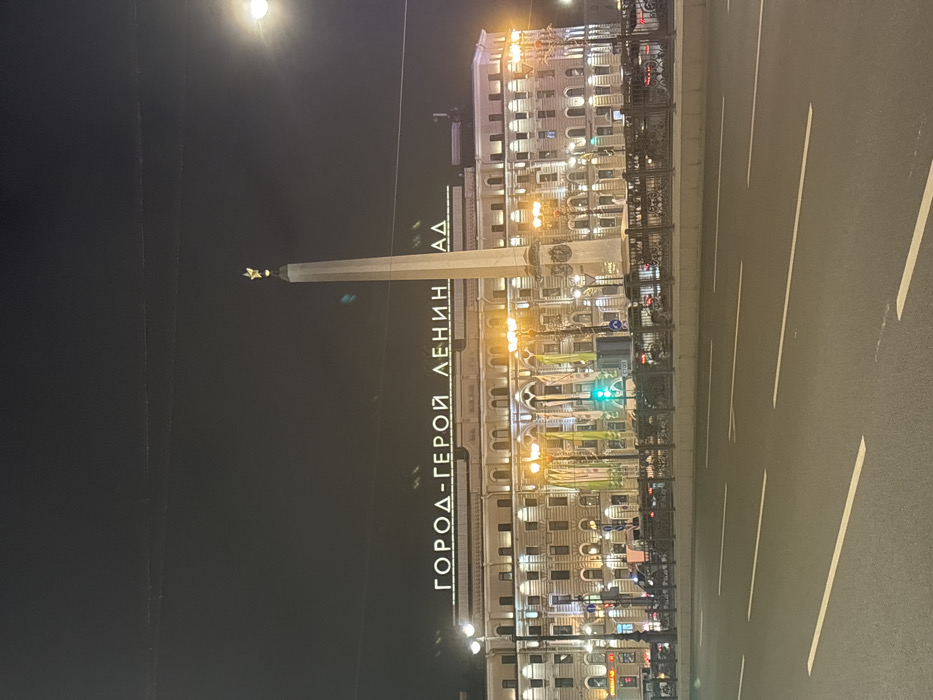 A nighttime scene features a brightly lit building, possibly a government structure, with numerous windows. In front, a tall obelisk topped with a star stands prominently. Text reads "ГОРОД-ГЕРОЙ ЛЕНИНГРАД" (Hero City Leningrad). A dark street with white lane markings is visible in the foreground. The photograph appears to be taken from a slightly elevated position across the street.