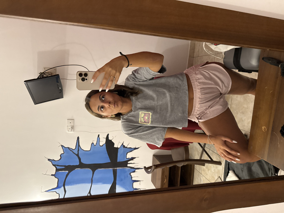A young adult female is depicted taking a mirror selfie in an indoor setting, likely a room within Thissamaharama, Sri Lanka. She is reflected from the waist up, holding a light-colored smartphone in her left hand to capture the image. The female has medium-toned skin, brown hair, and is wearing a grey crop top with a "SURF DAY" graphic, paired with light pink and white striped athletic shorts. Her eyes are wide and focused, and her lips are pursed in a slight pout. She wears gold hoop earrings, a thin gold necklace, a ring on her left ring finger, and two string bracelets. The background, visible through the mirror's reflection, consists of a white wall featuring a blue and black mural depicting a tree in a shattered-wall style. An older model black television is mounted on the upper right section of the wall, with visible cabling leading to two white electrical outlets below it. To the left of the subject, a wooden bedside table with a single drawer and a dark wooden chair are visible. A red garment is draped over the chair. The floor is covered in light-colored tiles. A grey suitcase and a white bag with a red logo are partially visible on the floor to the subject's right. The mirror itself has a dark wooden frame, and a wooden surface, possibly a dresser, is visible in the foreground with a black hairbrush and other small items.