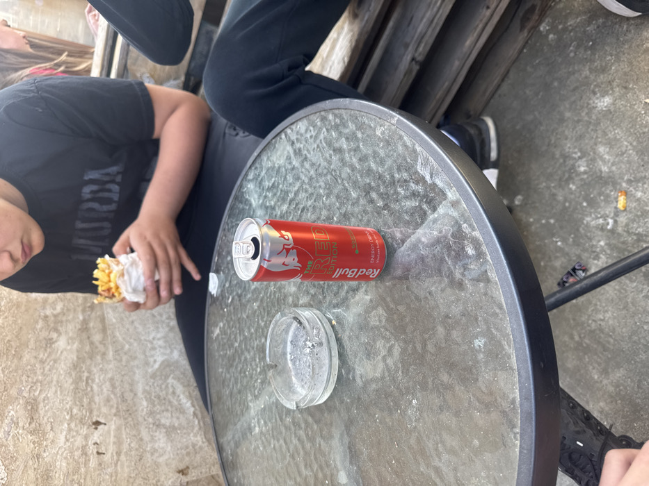 The image depicts an outdoor scene in Kazanlak, Bulgaria. In the foreground, a round, glass-topped table with a dark metallic rim supports a clear glass ashtray containing grey ash and one cigarette butt, positioned to the left. To the right of the ashtray, an open, upright red Red Bull "The Red Edition Watermelon" energy drink can is present. Seated behind the table, a young individual, wearing a black short-sleeved t-shirt with partial dark lettering "URBA" and dark trousers, holds a food item wrapped in white paper, which appears to be a wrap containing french fries and other components, poised for consumption. The lower legs of a second individual are visible to the right, clad in dark trousers and black sneakers with white soles. A third person's dark hair is partially visible in the upper right background. The background features a light-colored, textured wall resembling stucco or stone, and further right, dark wooden slats or structures are visible. The ground surface is light-colored concrete, with minor debris, including a small piece of food, near the table's base. The scene is illuminated by natural daylight.