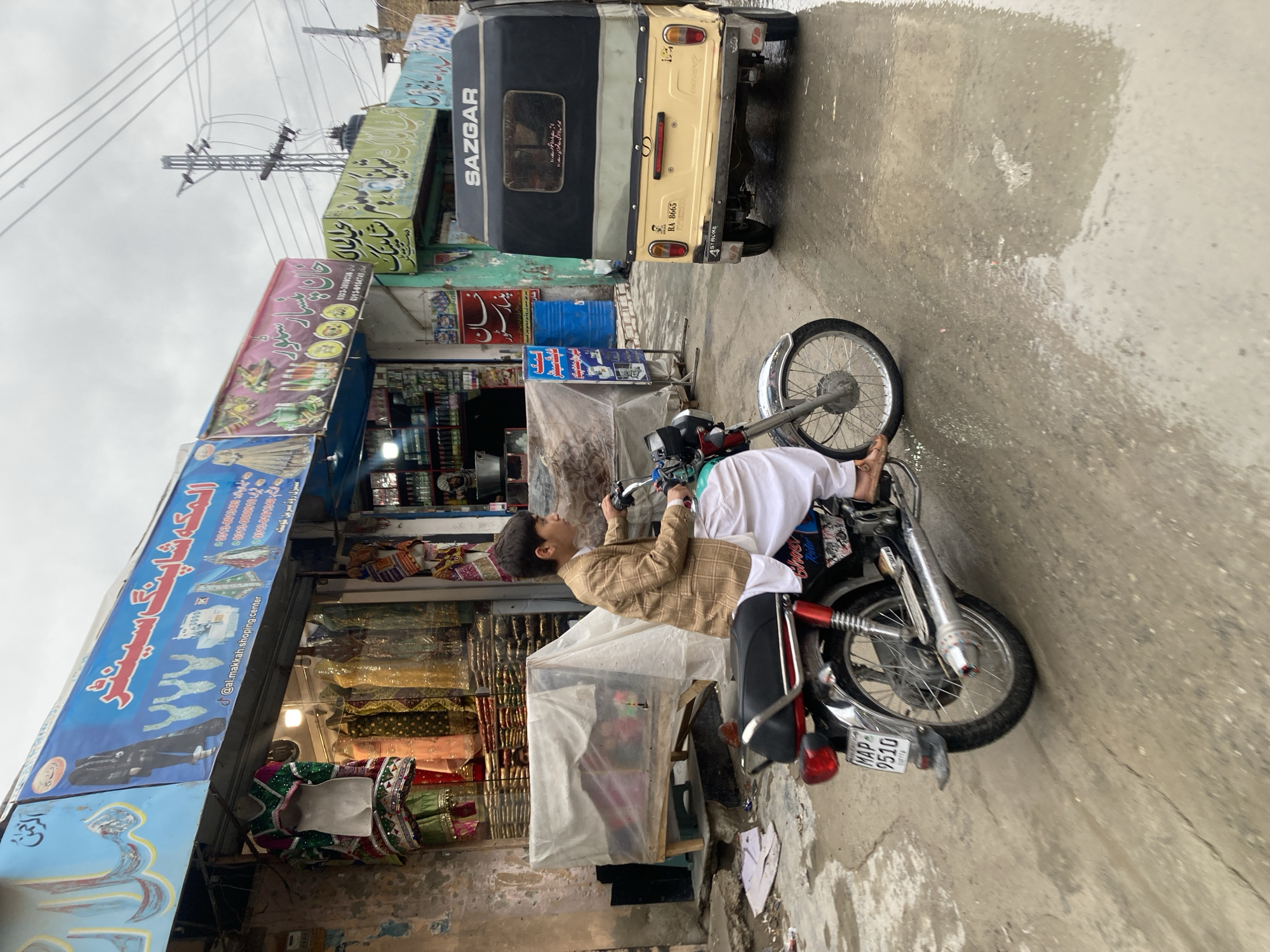 Here is a description of the image: The image shows a street scene in Quetta City Tehsil, Pakistan. In the foreground, a young boy is sitting on a parked motorcycle near a shop. The shop appears to sell traditional clothing and accessories. The boy is wearing a tan plaid jacket and white pants. A "SAZGAR" branded auto rickshaw is parked on the street behind the motorcycle. Various shop signs and utility poles are visible above the shops. The street appears wet, suggesting it may have recently rained.