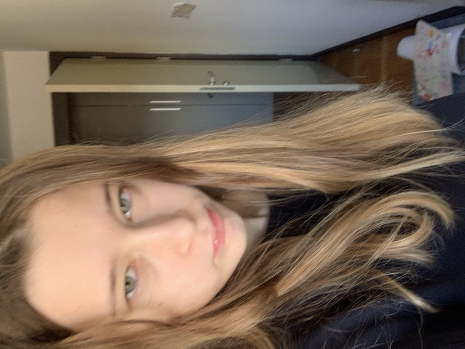 A young female subject with long, light brown hair and light green/hazel eyes looks directly at the camera