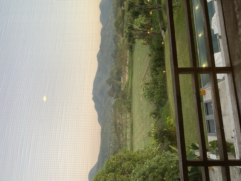 The image captures a panoramic view from an elevated position, viewed through a fine mesh screen that overlays a grid pattern across the entire scene. The location is in Pai, Thailand, at dusk or dawn. In the foreground, a dark wooden balcony railing with multiple horizontal bars spans the lower portion of the frame. Immediately behind the railing, a light-colored concrete patio is visible. To the right, a rectangular swimming pool with turquoise water is partially visible, featuring illuminated internal lights and a metal ladder at its edge. To the left, a smaller, dark-tiled water feature or pool is present on the patio, adjacent to an orange planter pot. No individuals are visible. The midground features a neatly maintained green lawn. Beyond this, dense tropical vegetation, including various trees and shrubs, forms a natural barrier. Several small, glowing yellow-orange garden lights are interspersed within this foliage and along a curved pathway. Further back, an extensive agricultural field, likely a paddy, is laid out in distinct, linear cultivation rows. Scattered trees with varying canopies are distributed within and around this field. The background reveals a range of undulating, forested mountains, appearing in shades of green, stretching across the horizon. The sky above the mountains displays a gradient, transitioning from a soft orange-pink near the horizon to a pale blue at the top. A single, distinct, circular yellow-orange light source is prominently visible in the upper-mid sky, slightly left of the frame's center.