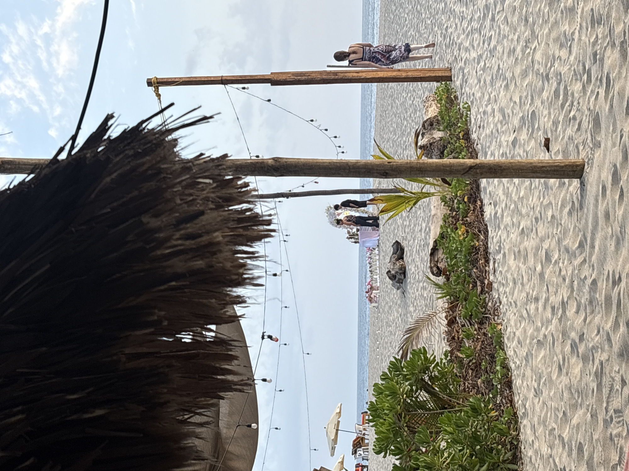This photograph, taken in Brisas de Zicatela, Mexico, captures a beach scene from a low angle, partially obscured by a large, dark straw umbrella in the foreground. The beach stretches into the distance, where a wedding ceremony is taking place, complete with an arch and seated guests. In the mid-ground, vegetation separates the sandy beach from the ceremonial area. A person wearing a patterned dress is lying on a wooden beam, facing away from the camera, in the background. Along the upper left, string lights are visible, enhancing the beach's ambient setting. Beach umbrellas and lounge chairs are also present on the beach.