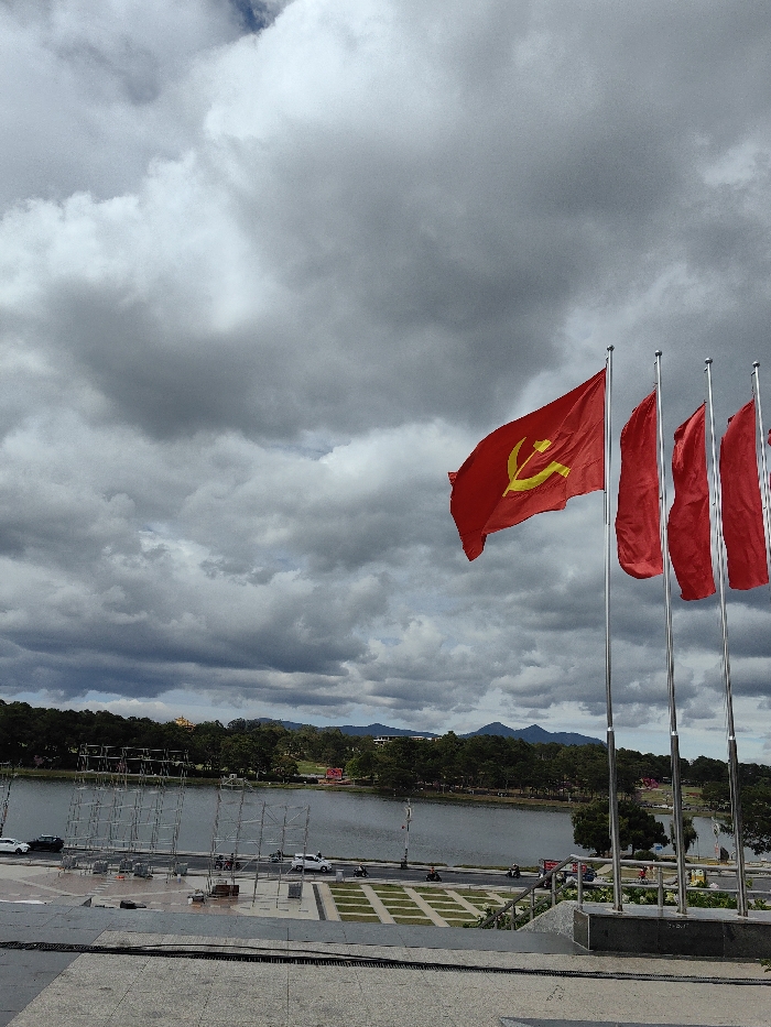 A group of red flags with a yellow hammer and sickle on one, flutter on silver poles against a cloudy sky. Below, a body of water stretches across the middle ground, lined with trees. Scaffolding stands on the near shore, and cars move along the road beside it. In the distance, low mountains fade into the overcast sky. The foreground features a tiled terrace with grass squares, adding depth to the scene.