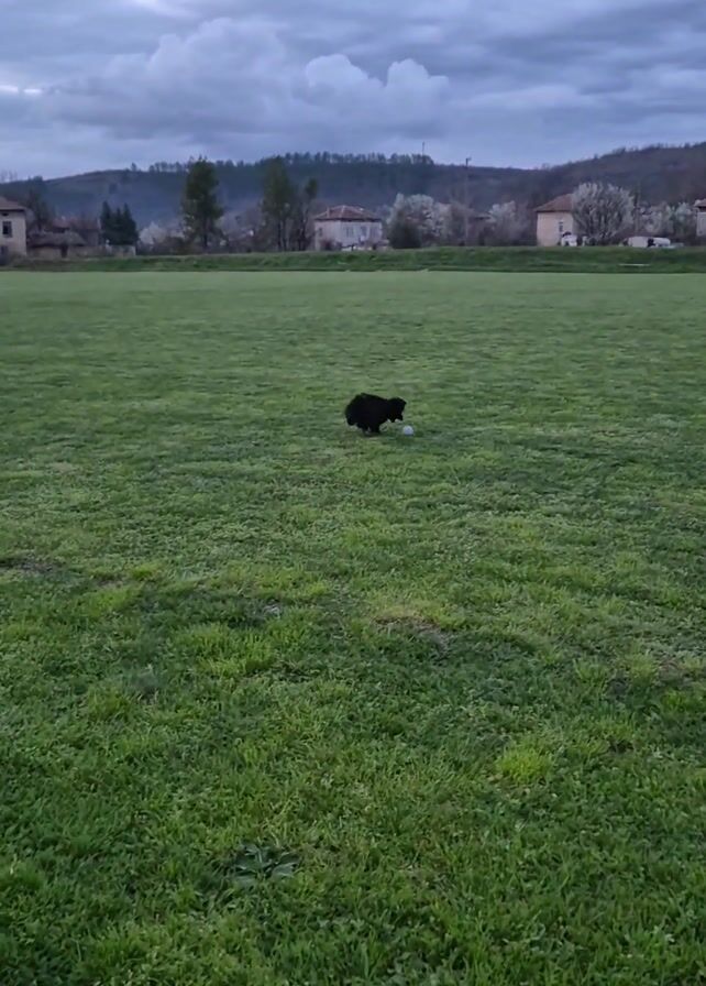 A small, black dog carries a white ball across a grassy field. The dog is running towards the camera, which is focused at a low angle. A person's leg and shoe are visible in the lower left corner of the frame, indicating that the video is being recorded from a stationary position. In the background, there are houses, trees, and a cloudy sky. The lighting suggests it is either early morning or late afternoon.