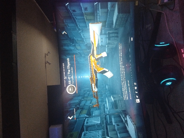 An upward-angled photograph captures a dimly lit indoor gaming setup. The central focus is a large, curved monitor displaying content from a video game, identified as Counter-Strike 2. The monitor exhibits a detailed image of an AK-47 assault rifle skin named "The Oligarch," featuring a design with white, black, and gold patterns, set against a virtual background of a warehouse filled with stacked crates. Text on the screen includes "AK-47 | The Oligarch" and "The Garbus Collection," along with descriptive text about the item. Below the monitor, a pair of gaming headphones with glowing blue LED earcups rests on a surface, entangled with various cables. A portion of a keyboard with red backlighting is visible to the right of the headphones. The upper section of the image shows a segment of a light-colored ceiling with two small, multi-directional light fixtures. No individuals are present in the scene. The location is an unidentified indoor room within the city of Unknown, Unknown.