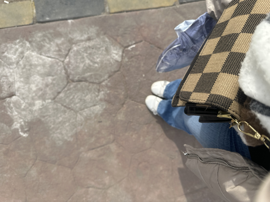 The image provides a first-person, downward view of an individual's lower body and personal objects, set against an outdoor paved environment in the city of Unknown, Unknown. The individual wears blue denim jeans and white athletic shoes. A light-colored, possibly beige, quilted jacket sleeve is visible on the left side of the frame. In the lower foreground, a tan and dark-brown checkered pattern handbag with a gold-colored clasp and zipper is present, partially obscured by a white, textured garment. To the right of the individual's feet, a crumpled blue plastic bag rests on the ground. The ground surface is composed of reddish-brown, irregularly shaped pavers or stamped concrete, exhibiting areas of lighter discoloration. A distinct border of yellow and dark-colored rectangular paving stones is visible along the right edge of the frame. The scene is illuminated by natural daylight, casting shadows on the ground surface.