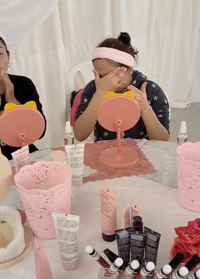 Four women sit at a table, applying facial cream. They are all wearing pink or white headbands, and each has a round, pink mirror in front of them. In front of each woman are several pink tubes of cream, along with other cosmetics such as lipsticks. There are pink decorative baskets on the table, as well as pink decorative placemats. The background appears to be an event space with white curtains. Behind the table are blue and silver balloons. Each of the women are massaging cream onto their faces.