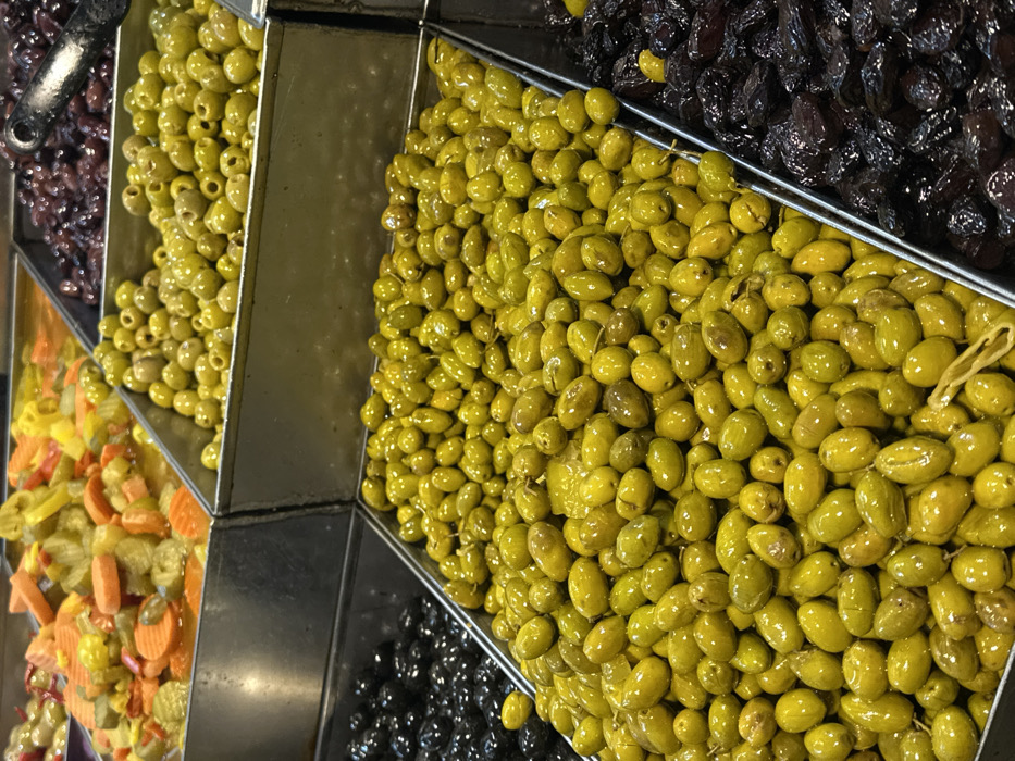 - "The image displays an overhead view of multiple varieties of olives and pickled vegetables organized within rectangular stainless steel bins, characteristic of a market stall" by FM-jqiIm2, licensed under CC BY 4.0