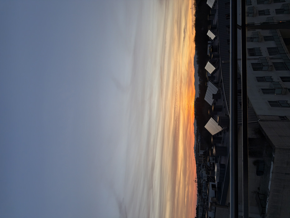 A cityscape stretches along the right side, featuring a multi-story building and numerous smaller structures. Air conditioning units are visible on the rooftops. The sky transitions from a vibrant orange at the horizon to a pale blue above, adorned with wispy clouds. The image is presented in a vertical orientation.