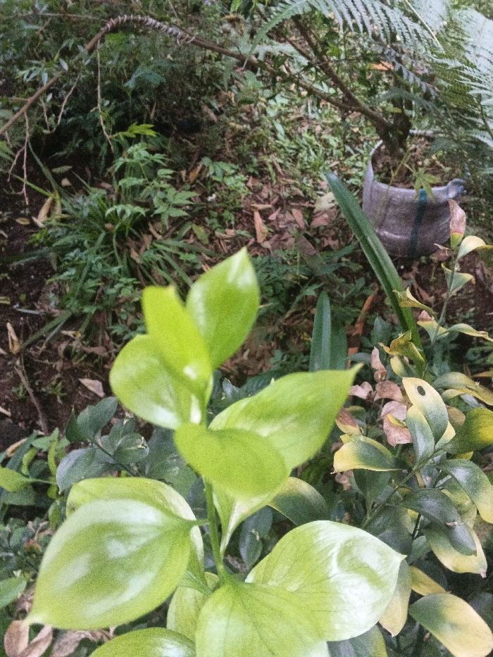 This image depicts a natural outdoor scene in Kon Tum, Vietnam, dominated by dense vegetation. In the immediate foreground, a plant with large, glossy, light-green leaves occupies the lower-left and central portions of the frame, slightly out of focus. To its right, a second plant features smaller, darker green leaves, some exhibiting yellow and brown discoloration. A slender, dark green leaf or blade is visible extending upwards from the lower right. The midground reveals uneven ground covered with green undergrowth, fallen leaves, and exposed soil. A grey, cylindrical container, possibly a modified plastic bottle or fabric pot, is located on the ground in the mid-right, containing a small plant or shrub and secured by a blue strap or tie. The background consists of various shades of green foliage, including a large fern frond in the upper right, along with branches and further undergrowth. No individuals or actions are depicted.