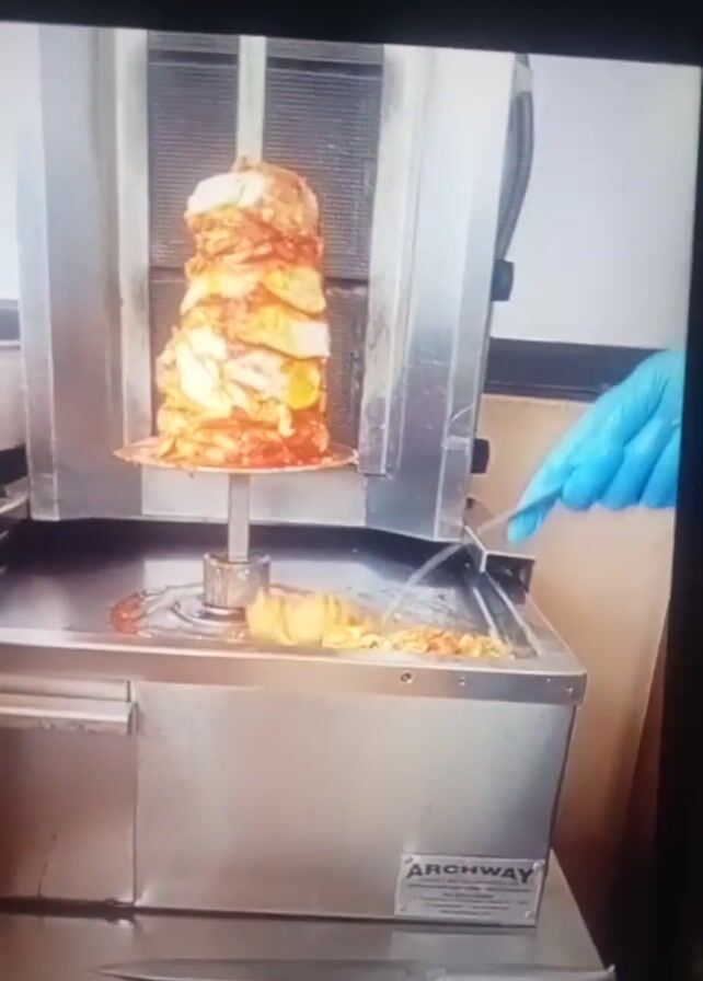 close-up of a rotating shawarma meat on a spit in a commercial kitchen. A hand wearing a blue glove is seen adjusting something on the machine. The machine is labeled "ARCHWAY". Flame bursts briefly from the meat as it rotates.