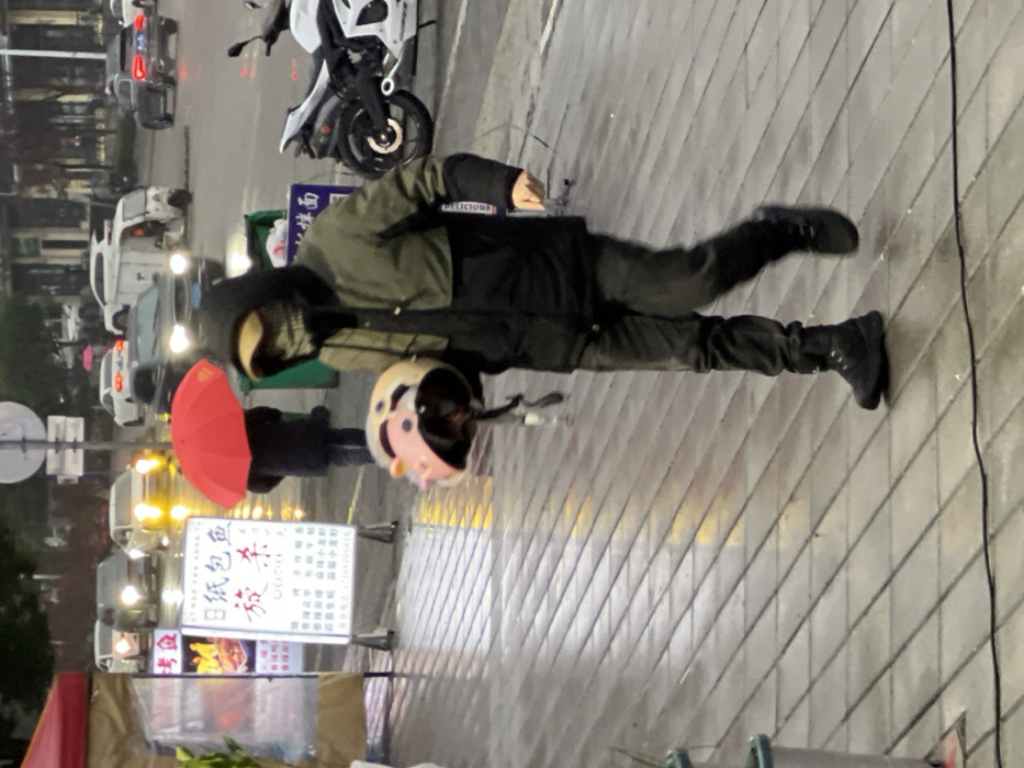 An individual is depicted walking on a wet, tiled urban sidewalk in Shuangfu, China