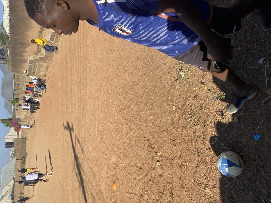 An outdoor scene in Barakin Akawo, Nigeria, depicts a group of individuals on a reddish-brown dirt field under bright sunlight. In the immediate foreground, a young male, dark-skinned, stands in profile facing right. He wears a blue short-sleeved football jersey with "JAPAN" and an emblem on the chest, black shorts, and dark sandals. He holds a dark object, possibly a mobile phone or camera, in his left hand. A white and blue football rests on the dirt ground to his left, near a small crumpled blue object. An orange training cone is positioned further back on the left side of the field. In the mid-ground on the left, several males are engaged in a football game or practice, visible in various casual sportswear. On the right side of the field, a low, rough concrete or brick wall serves as seating for a group of approximately eight to ten casually dressed males. One individual in a yellow shirt is distinctly seated on the wall. In the background, beyond the wall and field, several light-colored buildings with distinct roofs are visible, accompanied by scattered trees, including one with pink blossoms. A water tank on a raised stand is present on the far left horizon. Long shadows are cast across the dusty ground, consistent with either morning or late afternoon light.