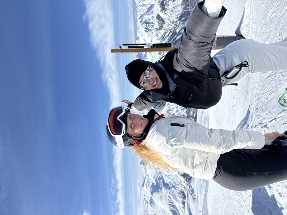 The scene depicts two individuals on a snow-covered mountain slope in Saint-Martin-de-Belleville, France