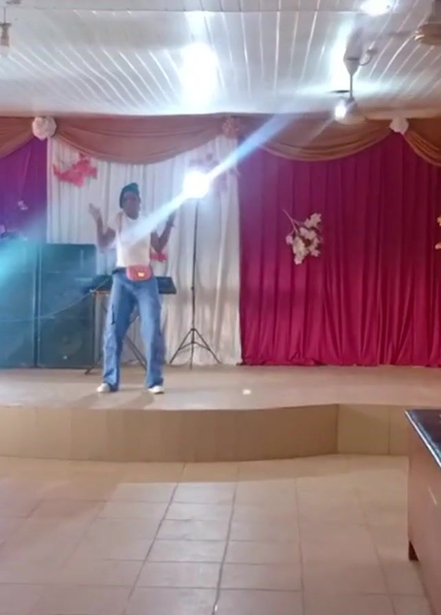 A young woman dances on a low stage in a large room. The room has a cream-colored tile floor and a white, paneled ceiling. The stage is decorated with pink, maroon, and gold curtains. A lighting rig is set up on the stage to the left. A desk is visible at the lower right of the scene, with a person seated at it. Another man in white clothes walks toward the stage.
