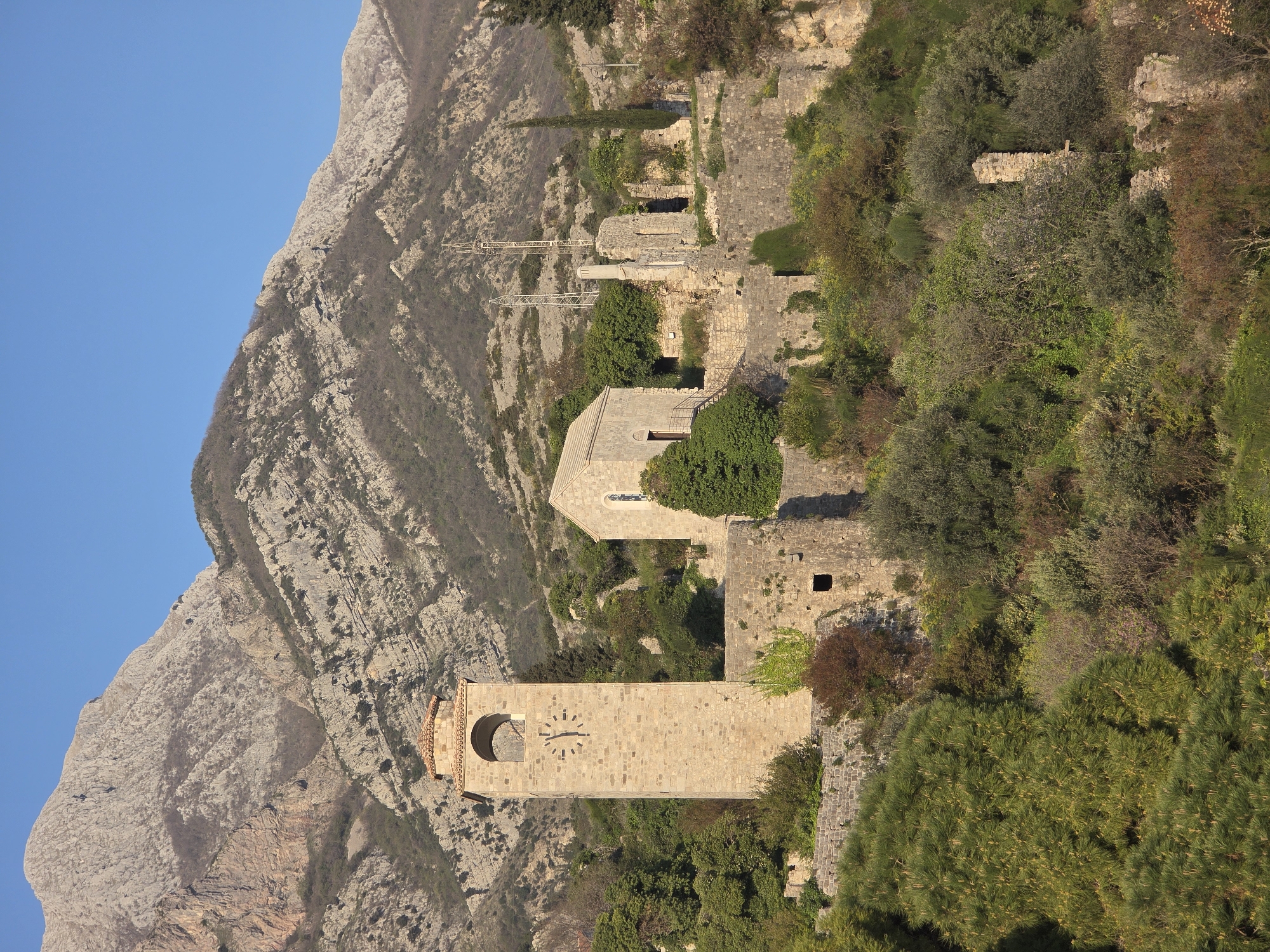 ruins of Stari Bar, Montenegro. The prominent features are the clock tower with its clock face showing a time of 2:20 and a roofless church building. The ruins are overgrown with foliage and situated against a steep, rocky mountain slope. The upper part of the mountain is bare rock. The scene is bathed in sunlight. The sky in the upper left corner of the image is a clear blue.