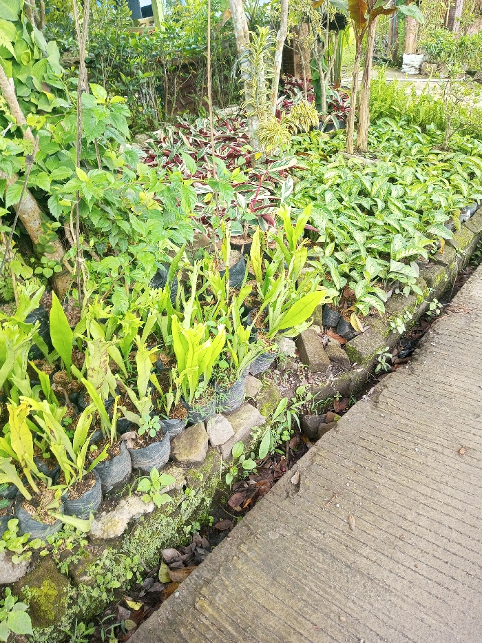 Lush greenery dominates the scene. Numerous small plants in black plastic bags line a concrete curb, bordering a paved path. The plants are various types, including ferns with bright green leaves and others with patterned foliage. Taller bushes and trees create a dense backdrop. The overall impression is of a well-maintained garden with diverse plant life.